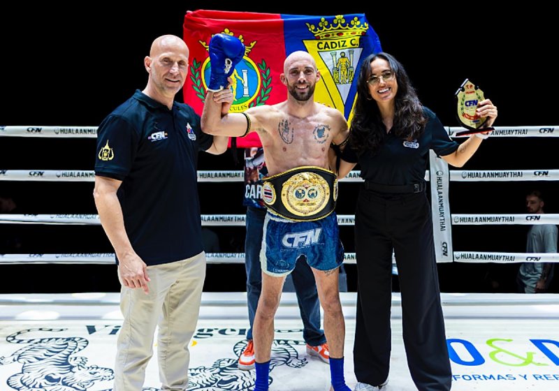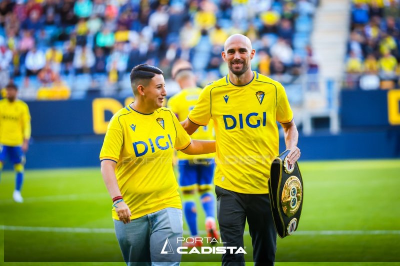 Carlos ofreció su cinturon de campeon a la aficion cadista acompañado en el cesped de Adriana Martinez que tambien realizó el logro de ser la primera mujer gaditana ganadora de un combate en el mítico escenario del Lumpineee Stadium.